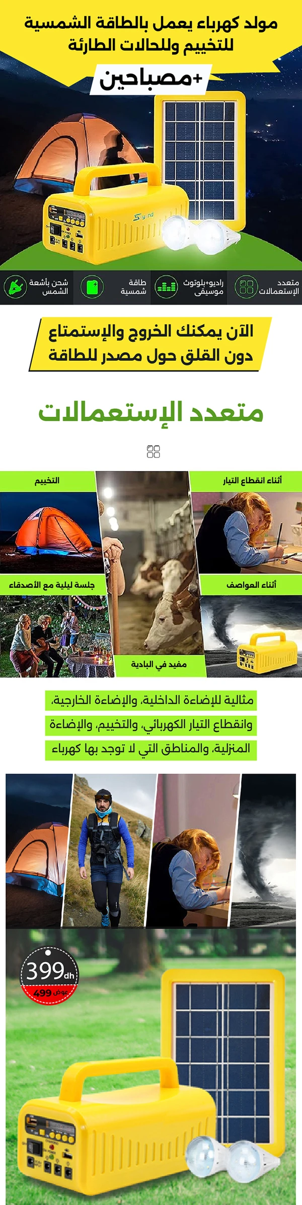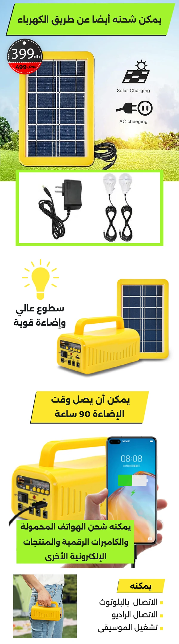 مزود بمصباحين LED للإضاءة ، يتم الشحن بطريقتين ، إما بالكهرباء أو عن طريق الألواح الشمسية